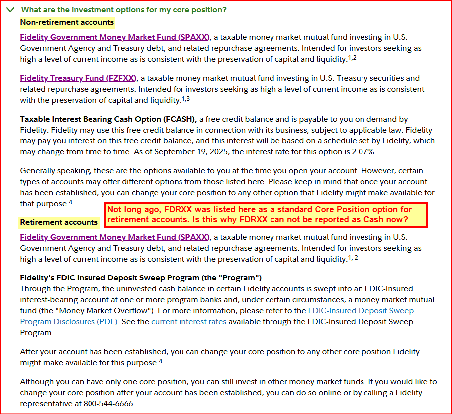 I noticed a recent change on the Fidelity website regarding Core Position/Account options. In the past FDRXX was listed as a standard option for Retirement Accounts but now it is not included in the list. If Fidelity has indeed removed FDRXX as a standard Core Position option then is that perhaps the reason why we are no longer being given the option to have it reported as Cash in Quicken….even though in our online accounts FDRXX is still listed as the grandfathered-in Core Position?
