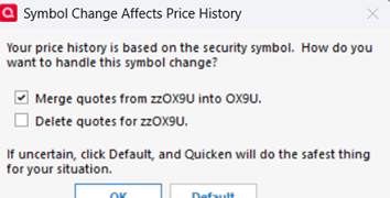 Create Backup. Reset Quicken NetBenefits Account in Account Details Online Services tab. Got the question, was the security renamed? I selected “It was renamed, but will update this myself”. The new name only has prices from 9/19/2025 to current. Quicken’s AI ChatBot told me to make up a symbol since the fund is non-public. I put a “zz” in front of the symbol that Fidelity has in the download (Fund Code). Made the symbols the same for both securities.