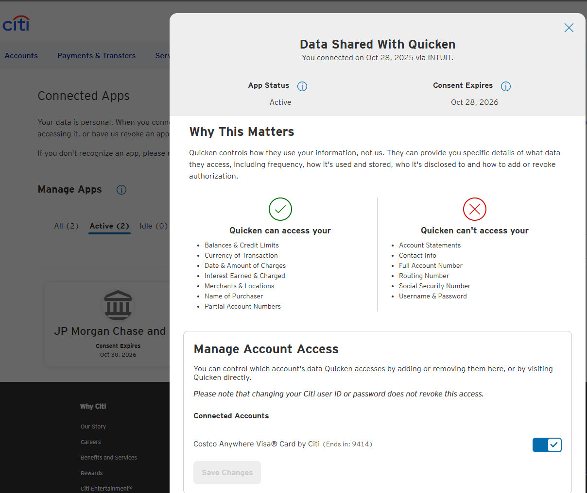 My downloads for my Costco Citi Card stopped working on April 16, 2025. In fact, disappeared from the update list entirely. Tried to do a "setup now" from the account edit screen (Online Services) and got through to "City Cards Need To Authorize Your Accounts". When I hit the "Sign In" button I get the following: "Sign in to Costco Anywhere Visa Card by Citi bank failed. Try again"