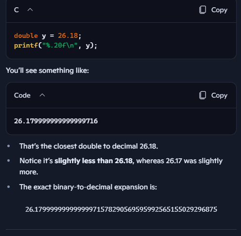 If you enter 26.18, the 64 bit binary equivalent when converted back to decimal is 26.17 followed by a long string of 9s. If you enter 26.1800000001, the result is 26.18 followed by a long string of zeros.