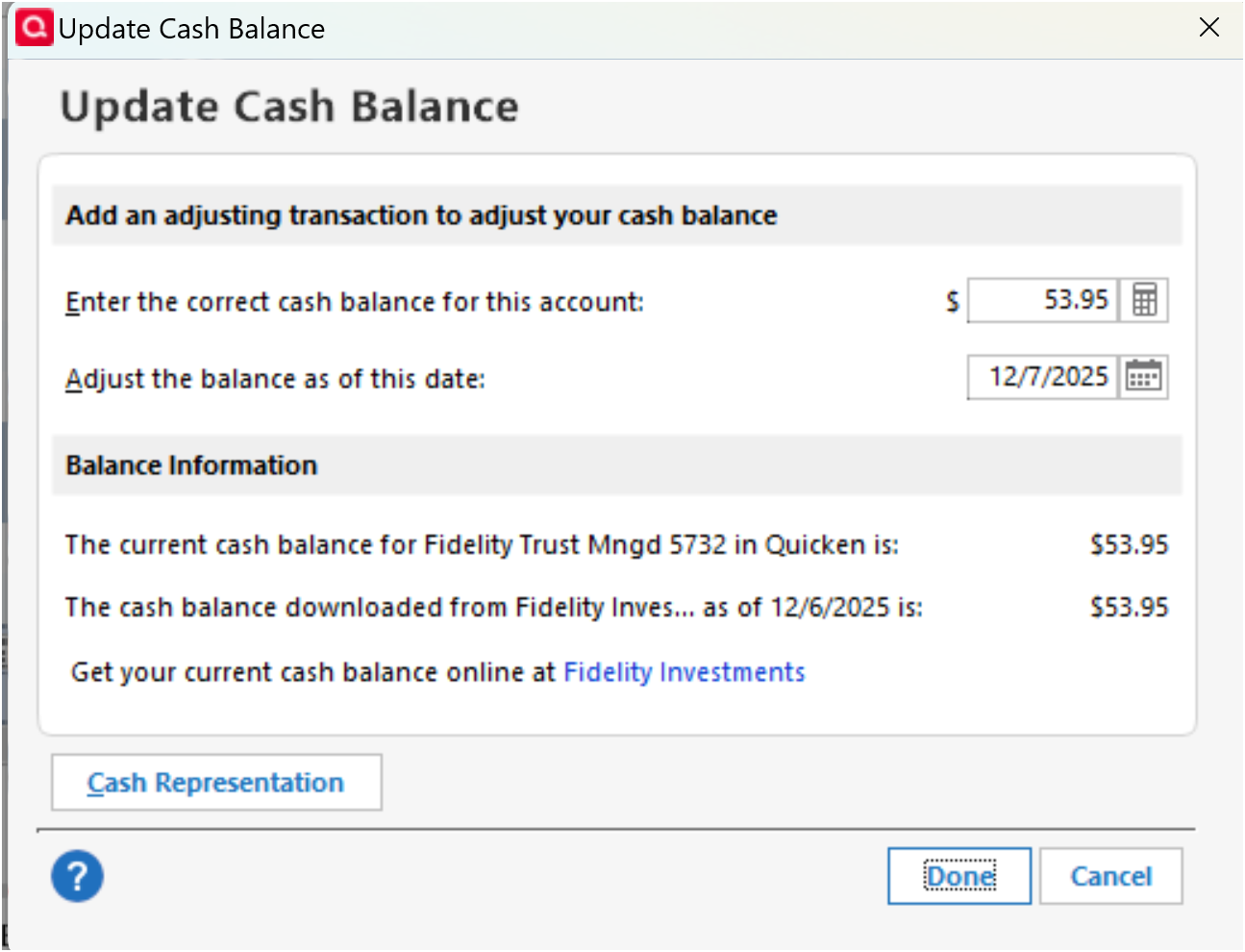 So, the Cash Balance in Quicken is always incorrect, and the reconcilliation of Shares in FDRXX is always flagged by Quicken as a discrepancy between that seen by Quicking and Fidelity.