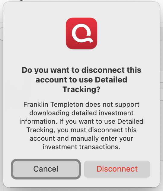According to Quicken, Franklin Templeton only supports the simple positions downloads. If you want complete positions and transactions, you have to deactivate the online access and manually enter your transactions after changing the tracking method on the General tab of the 'Edit Account' window back to complete positions.