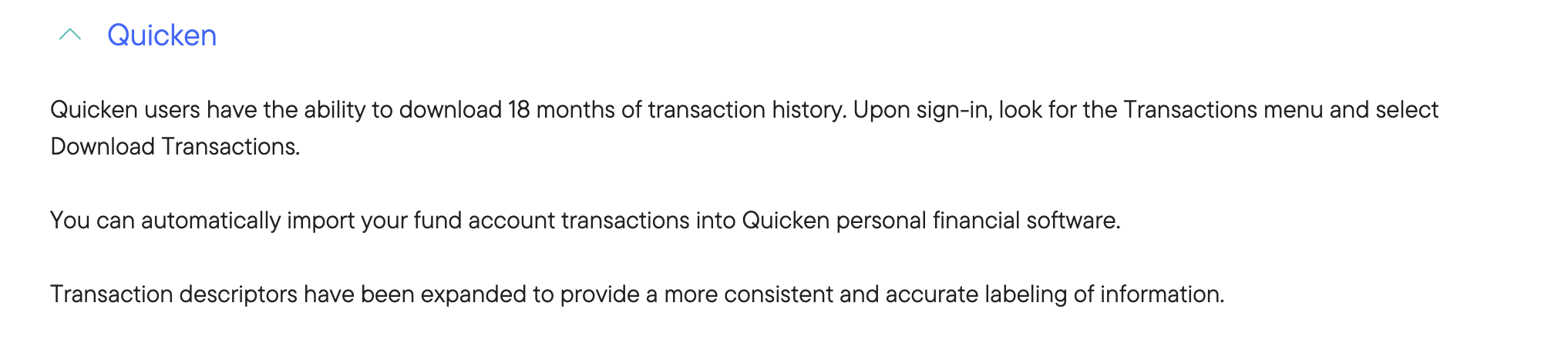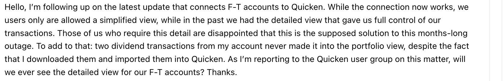 If you have a connection there, please look into this. The person I spoke with at FT in Nov. had no idea what I was even talking about. The fact that they still offer a QFX transaction download, even though it won't import, might lead one to believe they still have some kind of a plan for Quicken imports in the future.