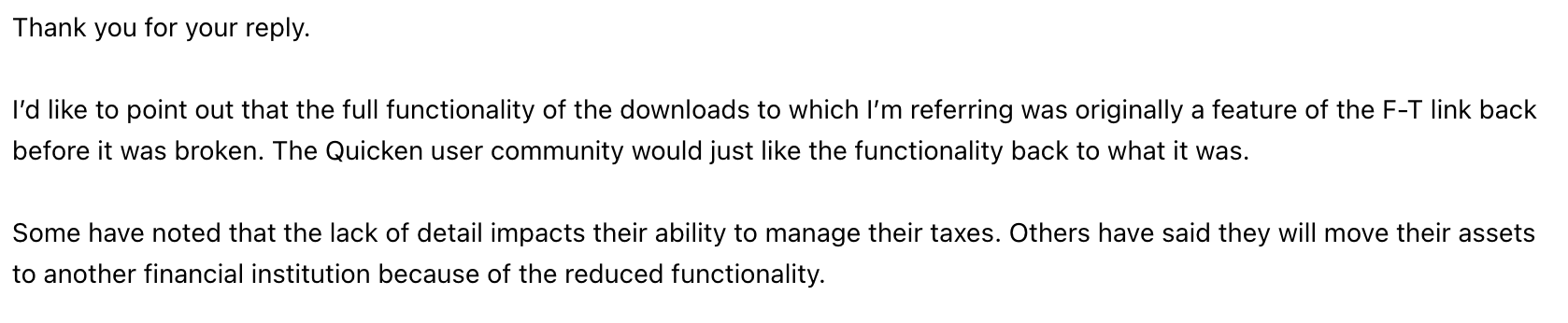I tried to reconnect today, but FT is no longer available as a financial institution in the list (there are a couple with that name, but neither is the right one). So this begs the question: is there an update to Quicken from FT regarding this supposedly restored feature? If not, I'll have to contact them again to find out if there is a revised date or even worse.