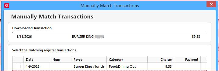 It appears that then when your screen resolution is above 100%, the Manual Match Screen Payee column only displays three or 4 characters making it hard to match transactions.