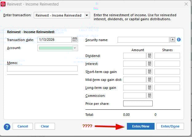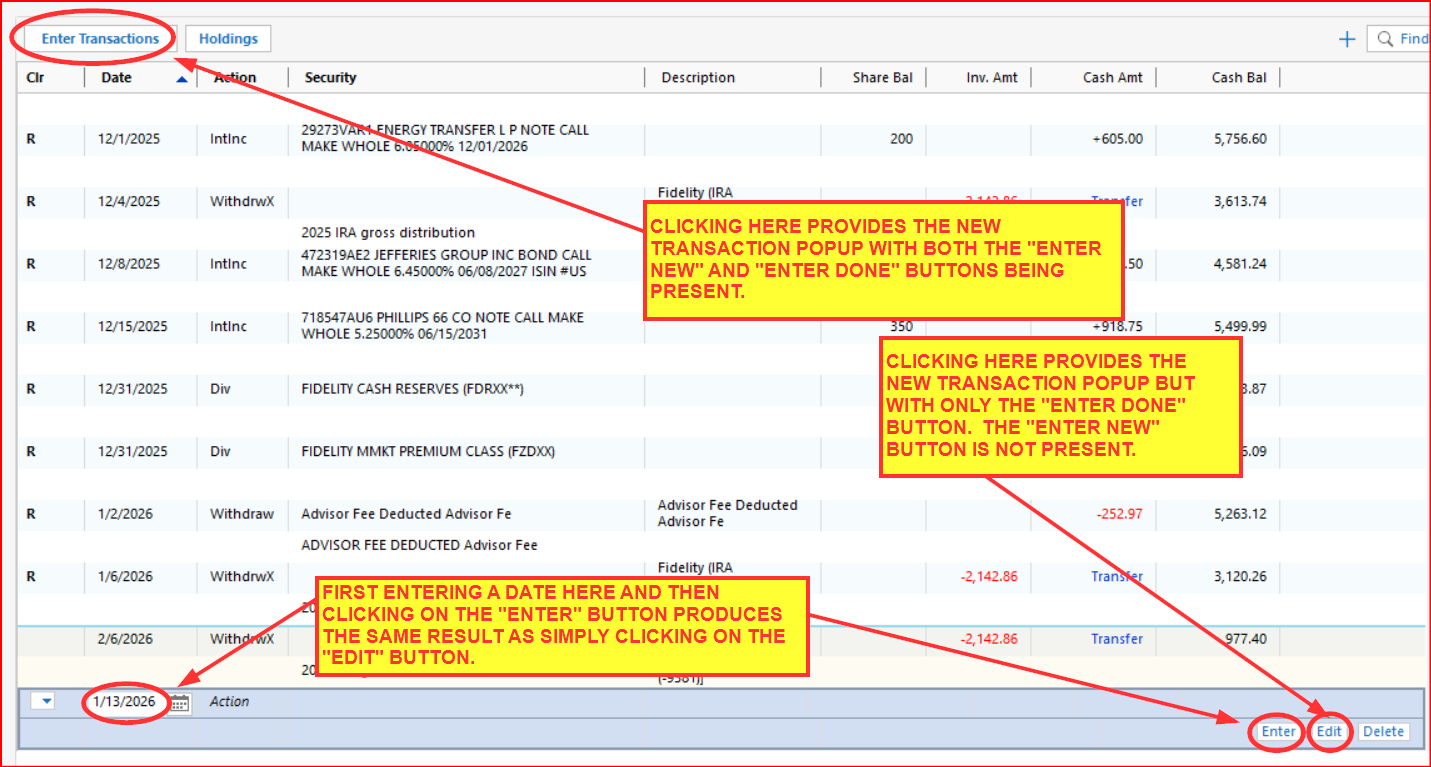 If you want to enter one or a series of transactions you can click on Enter Transactions to get started and it gives you the Enter/new option. Enter/New defaults to the same date and Action you used previously.