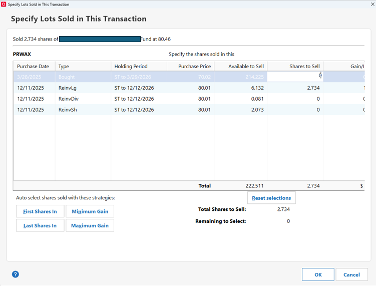 @rfmoskowitz Re: your second post, I suspect you did not enter the Price received per share or the total amount received before clicking on Specify Lots. In that case, Quicken is assuming that you sold the shares for zero and will show a loss of your entire cost basis.