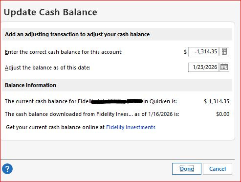 In fact my cash balance in Quicken is already correct, and my core fund is set to $0, because I have always forced them to be so. In the past, it meant doing a share adjustment and cash adjustment to fix the balances. More recently I simply block Quicken from making changes when it reports a fund and cash mismatch after downloading - I finally found that the way to do this is hidden behind the button to look at details, and if you do look at those details, the default when closing the window is to ignore the mismatch, which is the opposite of the default if you do not go into the details but simply close that mismatch window. And ignore is exactly the right behavior.