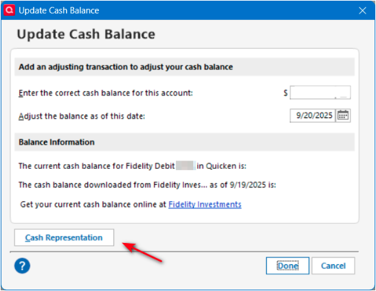 Click on that link and it will bring up the Update Cash Balance window. Click the Cash Representation button.
