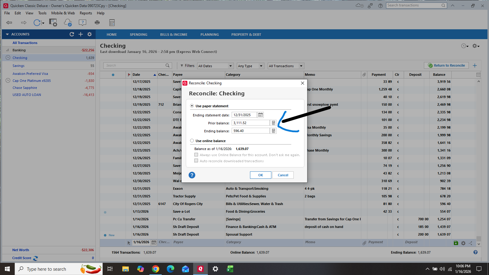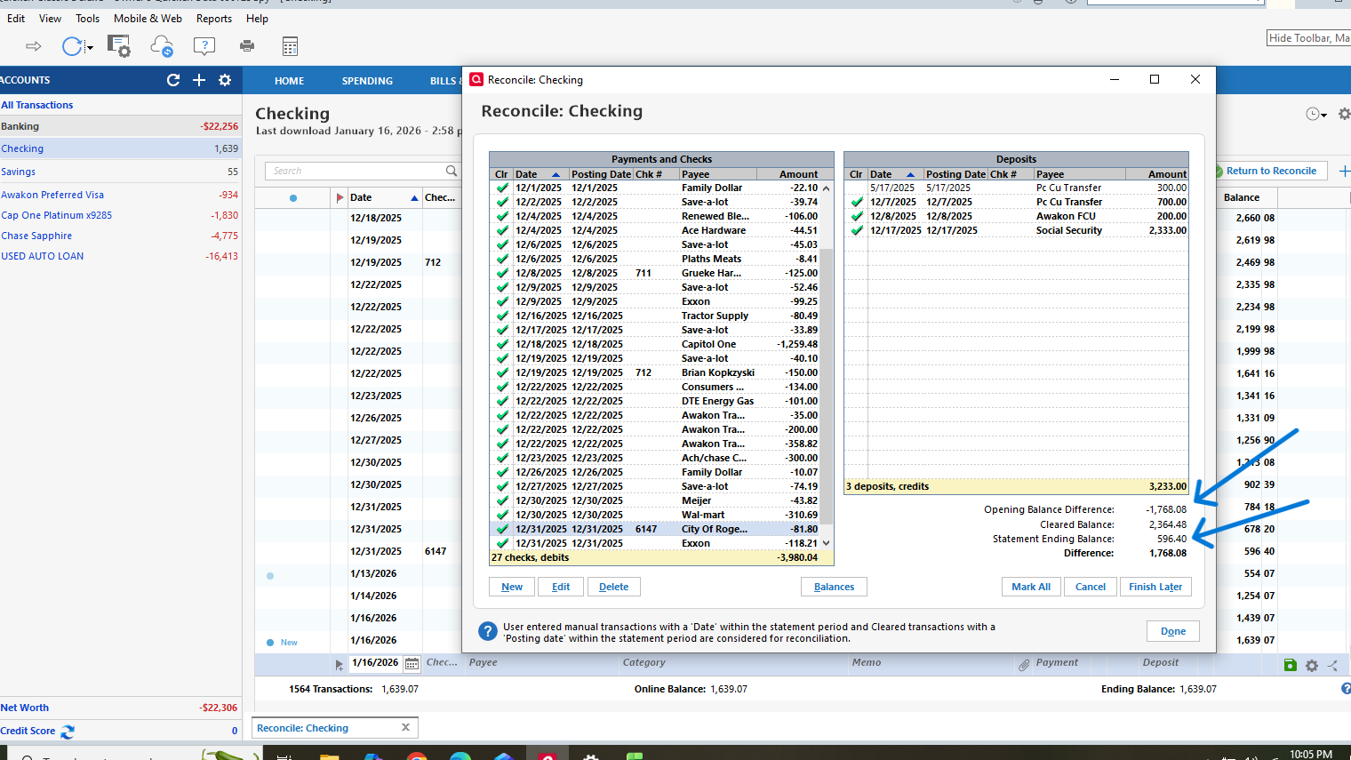 I'm having a problem reconciling also. Don't know if I'm doing the cut paste thing right, but I'll try.