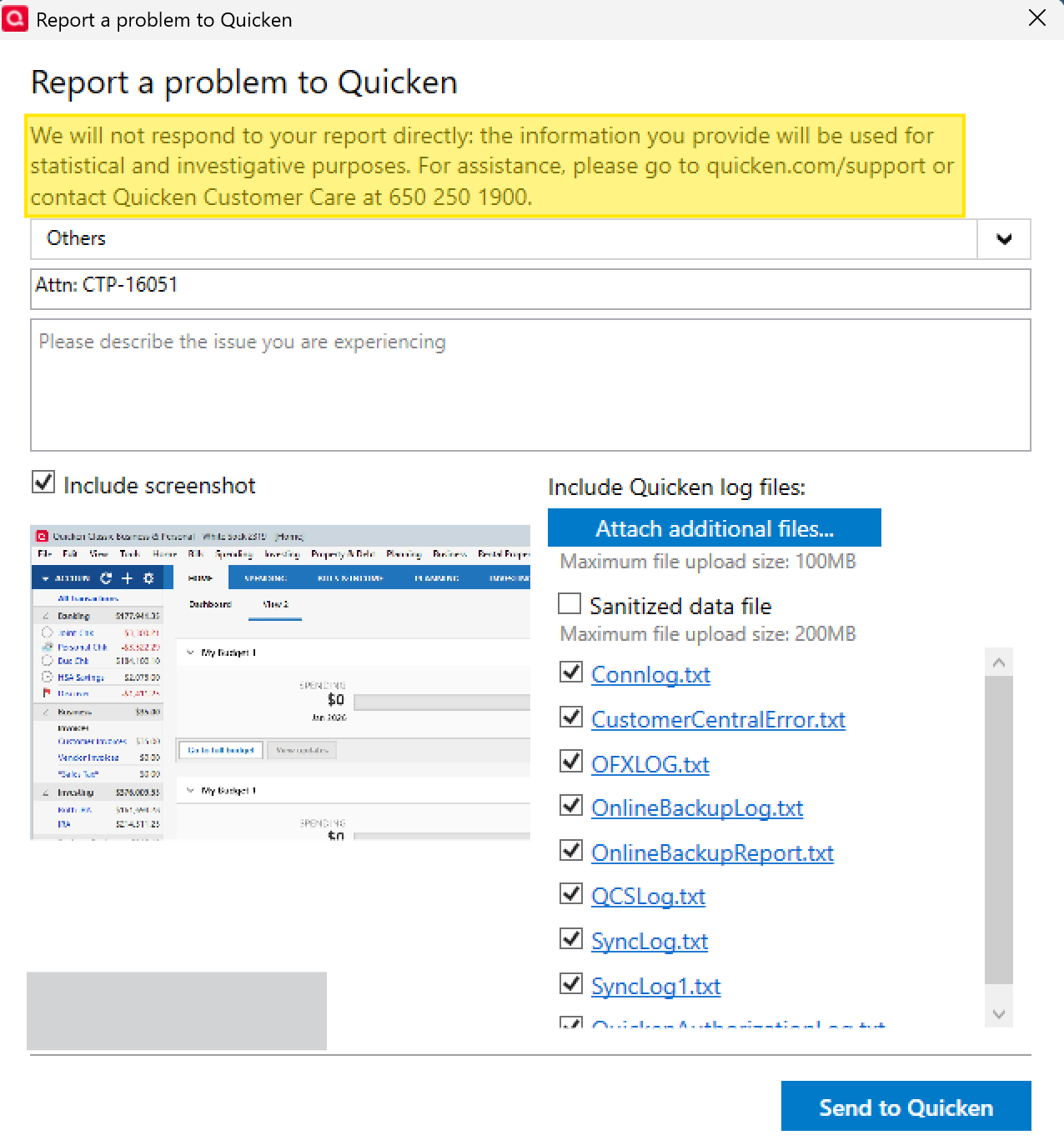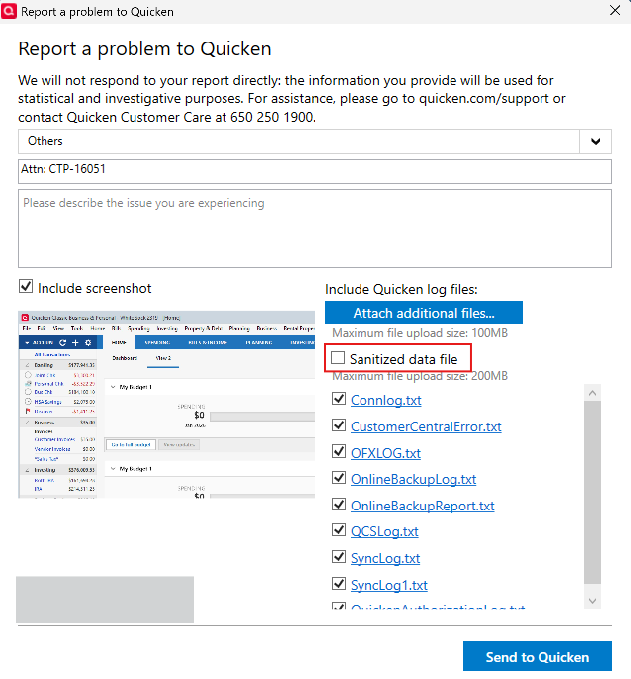 ——@bjohnsonSC — To submit a sanitized data file, go to Help > Report a problem in Quicken. You’ll see a checkbox option to include a sanitized data file there. When selected, Quicken will automatically generate the sanitized file for you—no extra steps needed.