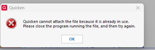 Quicken does not support storing active data files on any cloud-based or network-synced drive. For best results, Quicken data files should always be stored locally on your computer, and cloud services should be used only for backups (automatic or manual) after Quicken has been closed.That said, if you are experiencing this attachment issue and your Quicken data file is stored locally—and has never been synced to a cloud-based drive location—please let us know. This distinction is important and can help our teams further narrow down the root cause.