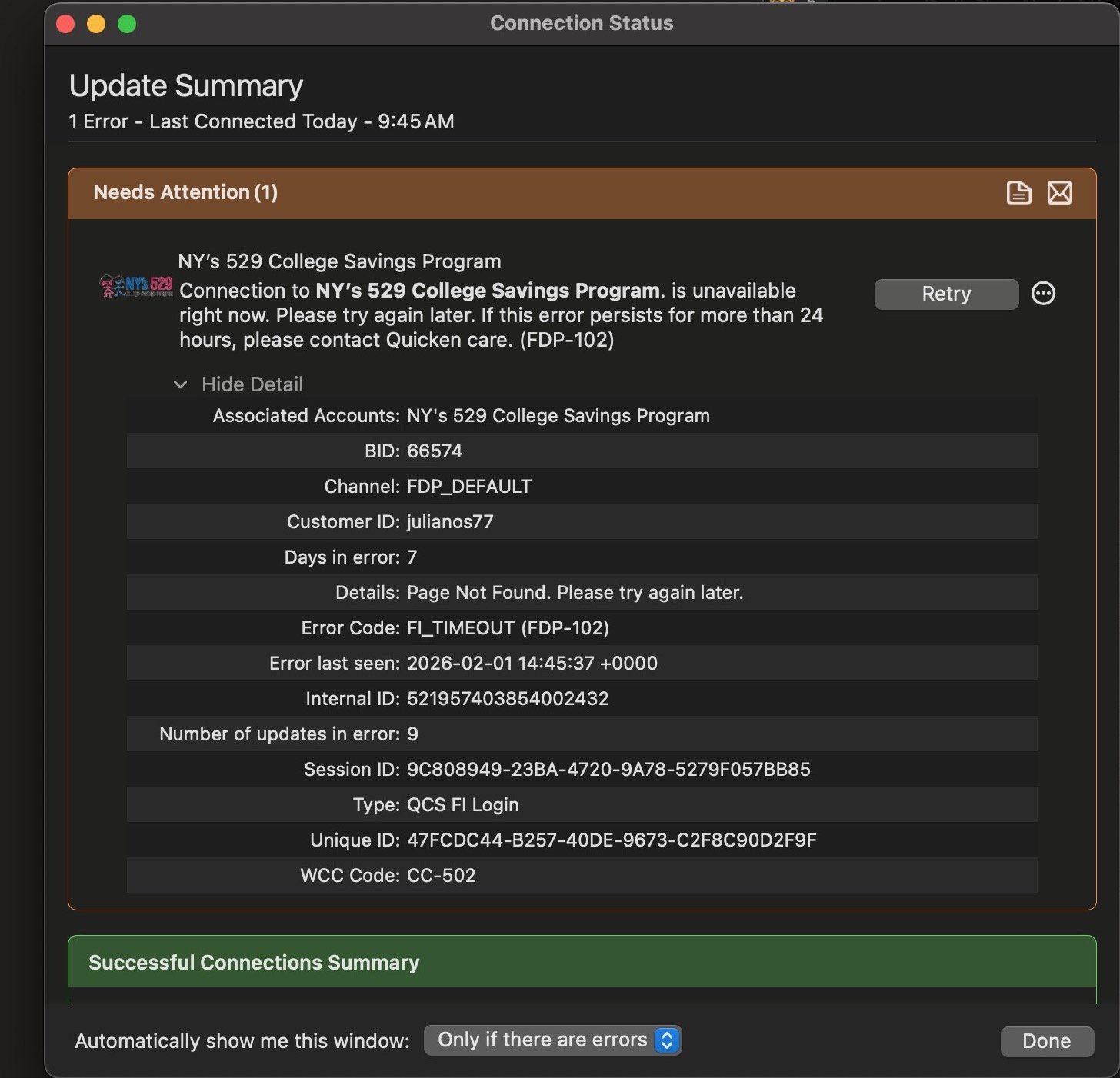 I'm another person chiming in to say that I can't connect to my NYSaves 529 account via Quicken for Mac either, with the same FDP-102 error that others have reported. This also started for me about a week ago (01/23/2026). Any help in resolving this would be great — I'm also able to login to the site with my username and password, and my password doesn't have any of the special characters referenced above either.