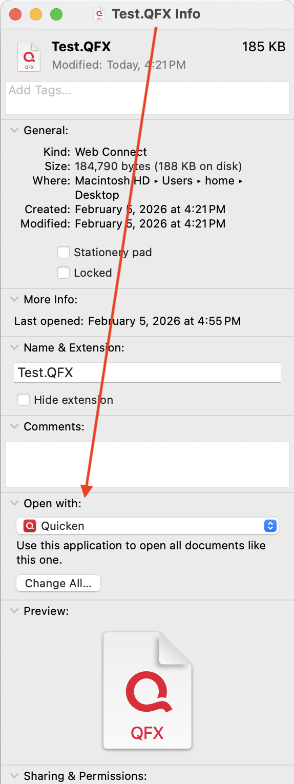 If not, select Quicken from the dropdown menu, and then just below that, click the Change All button to "Use this application to open all documents like this one". That is, any time the Finder encounters a QFX file to open going forward, it will open it in Quicken.