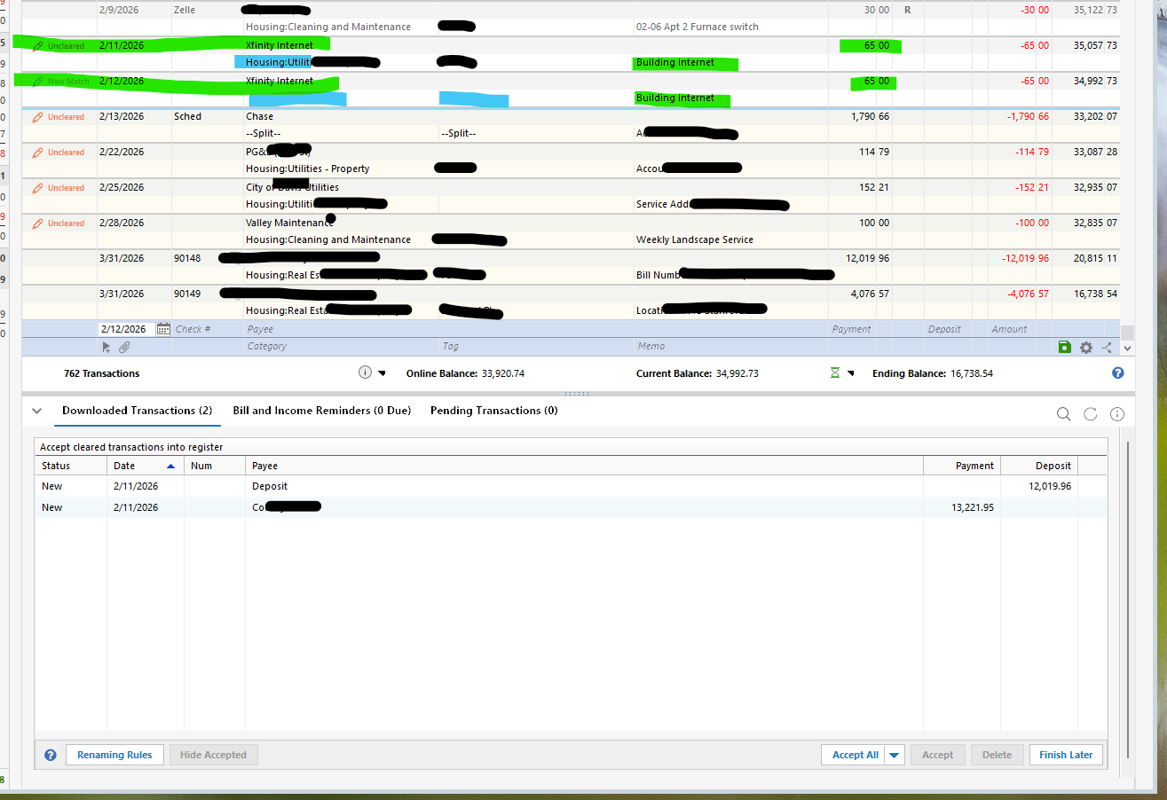 The bill is showing as a "Pending" transaction on my bank web app. But it does not show as a "Pending" transaction in my Quicken desktop app. It's as if it matches the pending transaction to a manual bill reminder, and then removes it from the pending list, and adds it into the register with a blue pencil. The date of the pending transaction on the bank web app is 2/6/2026, which matches the blue pencil transaction date.