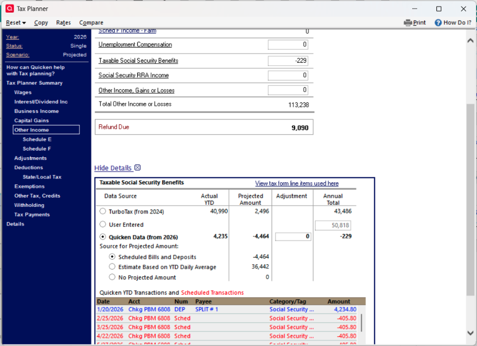 Then I deleted the scheduled SS payment transaction and reentered with the correct splits again. It's been a day since this step, and TP is showing incorrect Taxable SS Benefits.