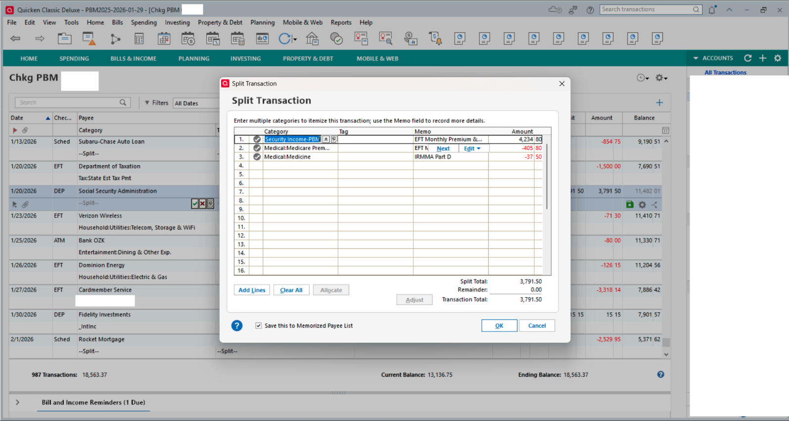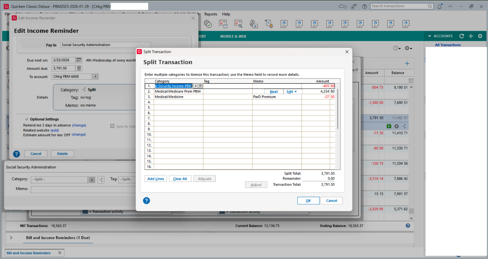 I had a similar issue with my SS Reminder splits starting with January, as well….a little different in that it replaced the gross SS benefit amount with the net deposit amount and then removed the splits for the various deductions. This happened in 3 out of 4 SS income Reminders in 3 different data files. I tried to fix the splits but they could not be fixed. So, I ended up deleting the bad Reminders and setting up new ones to replace them. So far, it looks like they are OK and stable now.