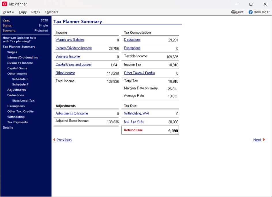 I've noticed that sometimes Tax Planner (TP) sometimes randomly changes the option I selected to one of the other options. That, can cause some significant errors in TP's projections. It does not happen a lot but every few days I will find that the TP projection of tax refund or tax owed was changed from the last Quicken session. That prompts me to review every section of TP and it's always been found that this issue occurred in just 1 or 2 sections. I fix those and everything if fine, again, for a few days and then the same thing happens in a different 1 or 2 sections. So, yeah, there does seem to be some reliability/instability issues with the 2026 TP.