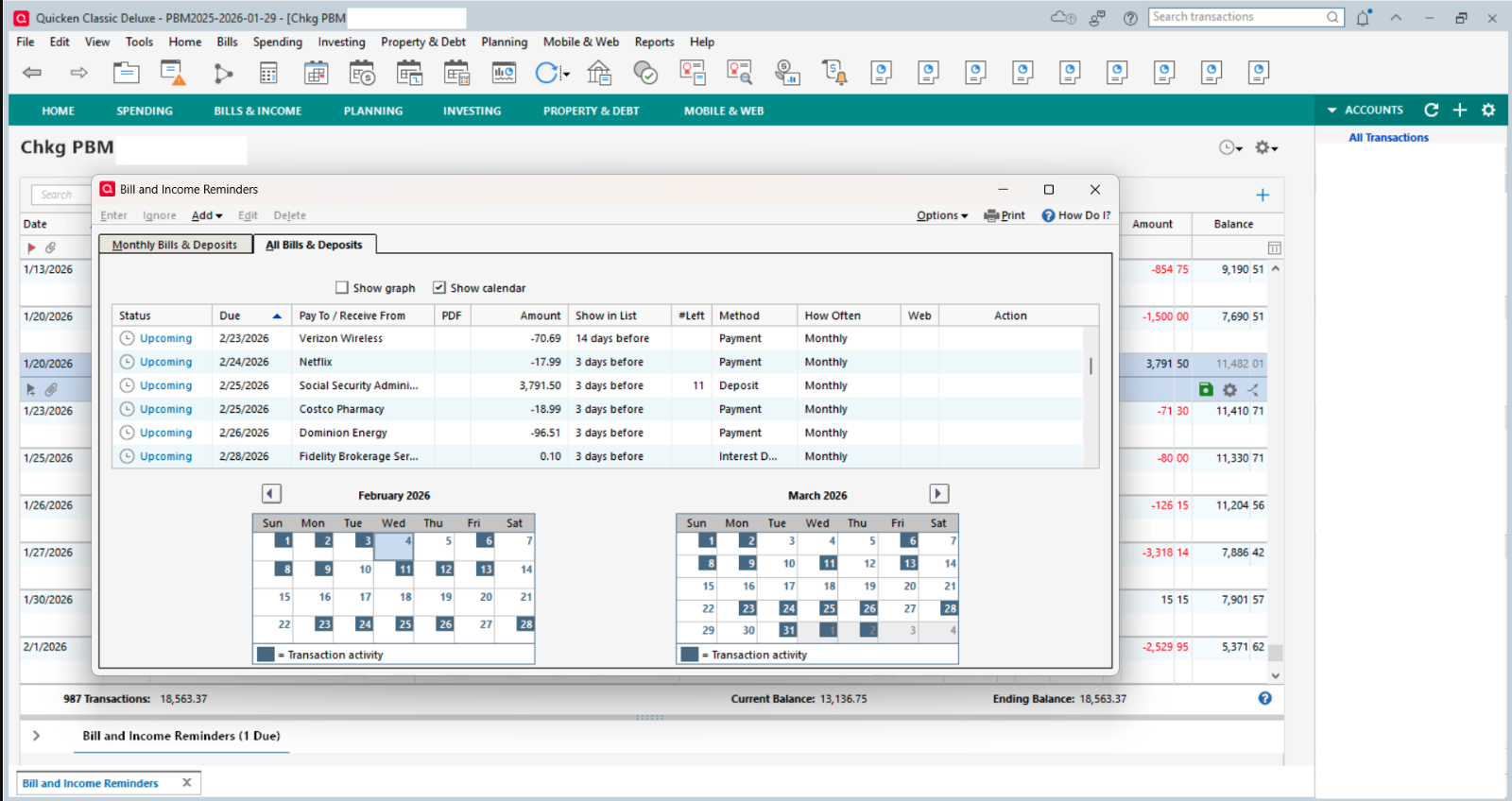 February scheduled transaction for SS income for 2/25/2026