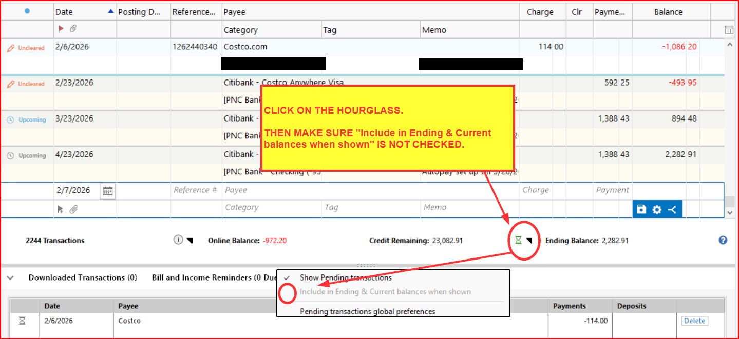 - If one wants to have pending transactions to be shown in the account register so the account balance reflects it: Before or after the pending transaction is downloaded below the account register, manually add it to the register. When the posted transaction gets downloaded, Quicken will generally match it to the manually entered transaction.