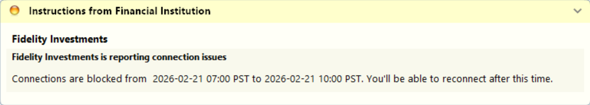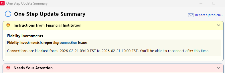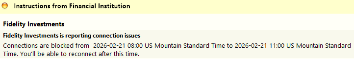 Transaction download not working at all today for all Fidelity accounts 2/21/26. CC-505 error on all Fidelity accounts.