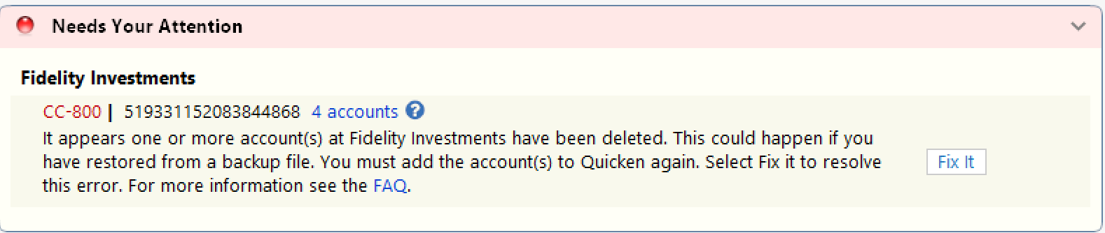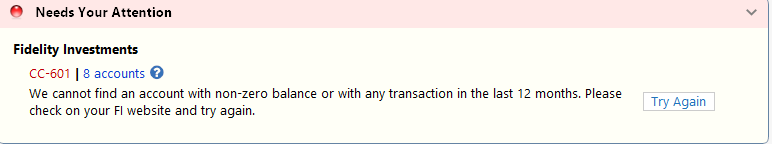 I can't get my brokerage accounts at Fidelity to update. Quicken is throwing "CC-601 We cannot find an account with a non-zero balance or with any transactions in the last 12 months. Please check on your website and try again."