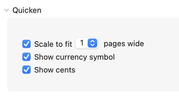 As for adjusting column widths from Page Setup, that was never available in modern Quicken Mac in its 12 years of existence. (If you're referring to the legacy Quicken Mac 2007, that program definitely did cram more data on the page.) I'd note that you can make columns narrower in your report on screen, and they will appear narrower in the printed version as well, but it entails some trial-and-error if you're trying to achieve a specific goal for the column widths.