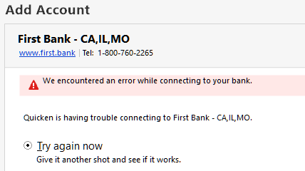 First Bank did not change their password requirement or their external URL (i.e. my login still works on their website at the same URL). In Quicken, I completely deactivated the account and tried adding the account anew. Quicken DOES login to First Bank because Quicken correctly prompts me to ask which form of 2-factor authentication to use (which I have set up at First Bank). When I choose one and then enter my code, Quicken then will error after it displays "Looking for your accounts". It errors with "We encountered an error while connecting to your bank".