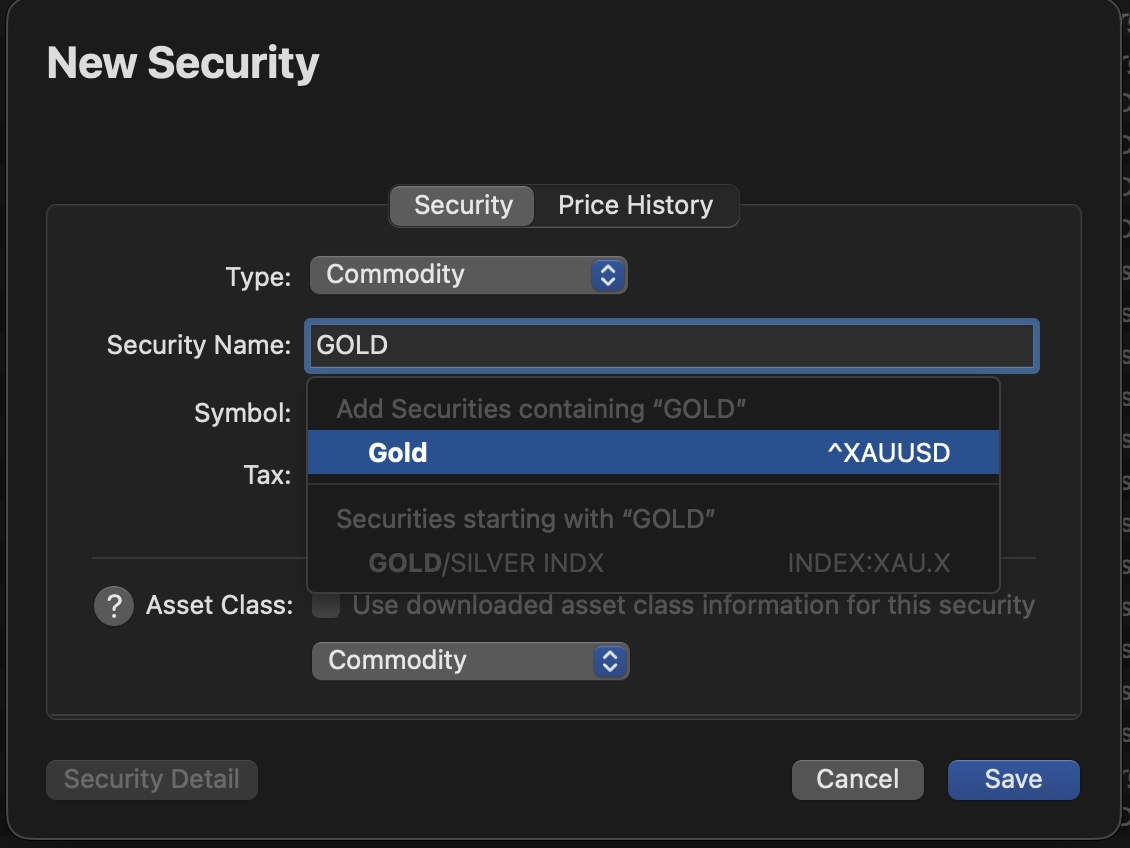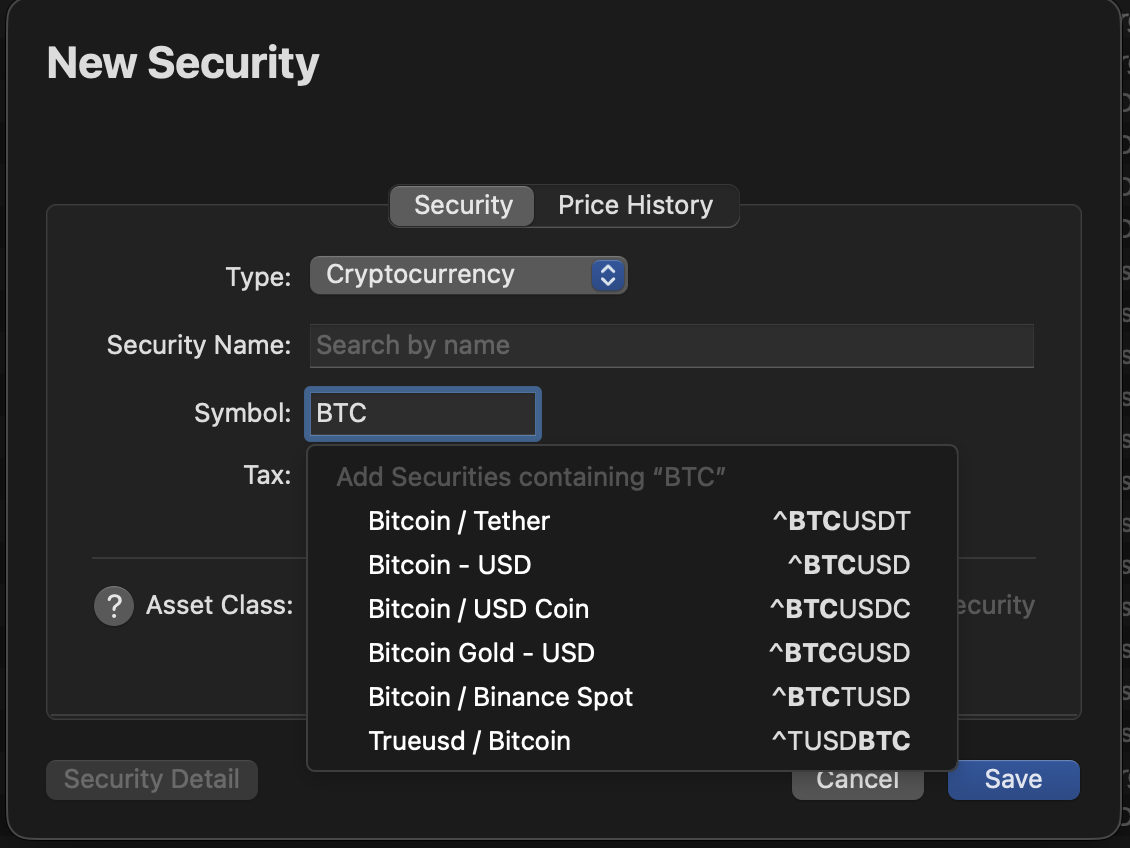 @ed1chandler Open the Securities window and add a new Security. The Type pulldown now includes selections for Cryptocurrency and Commodity. You can then search for an appropriate symbol.