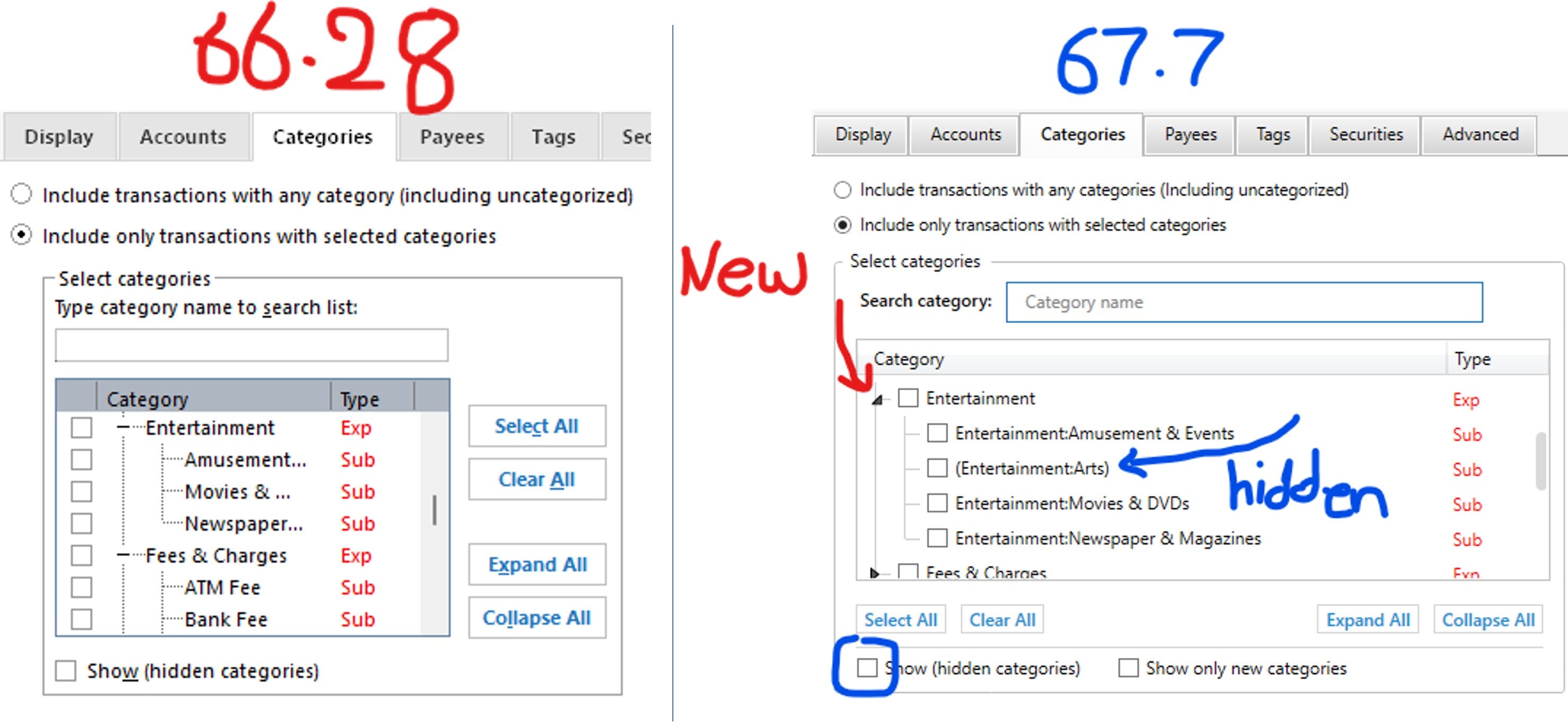 Seems like the hidden "sub"-categories are now displayed even though the "Show hidden categories" box is not checked! This is isolated to "sub"-category, not the Parent category. Look at the right image where Entertainment:Arts in parenthesis is displayed, tho it is a hidden category. EDIT: This seems to be cosmetic and does not impact report values.